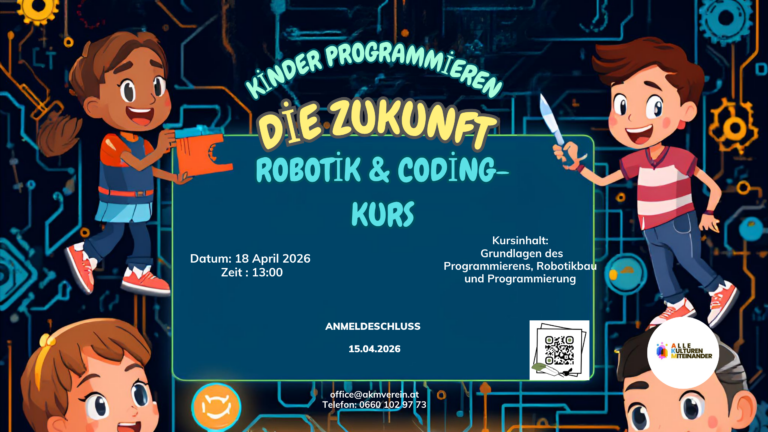 24März Allgemein Kinder programmieren die Zukunft: Robotik- & Coding-Kurs In unserem Kulturzentrum organisieren wir einen Robotik- und Coding-Kurs für Kinder (9–12 Jahre, Anfänger)! In diesem.